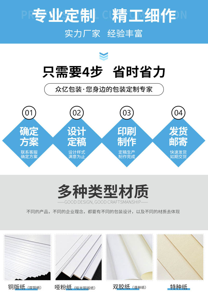 印刷紙張:銅版紙、雙膠紙、啞粉紙、珠光紙、其他藝術(shù)紙(藝術(shù)紙種類較多我們可以免費提供紙樣供您選擇)