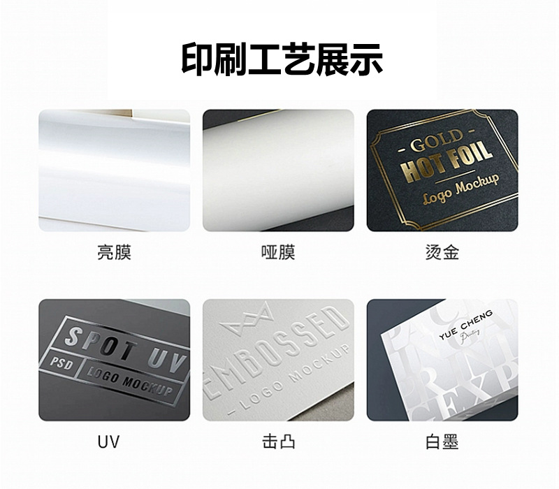 常用工藝:覆膜(啞膜、光膜)、壓紋、凹凸印、局部uv、燙銀、燙金、印專色(PANTONE色)、鏤空、鐳射、打孔、疊印、絲網(wǎng)印、透印、過光油、啞油等