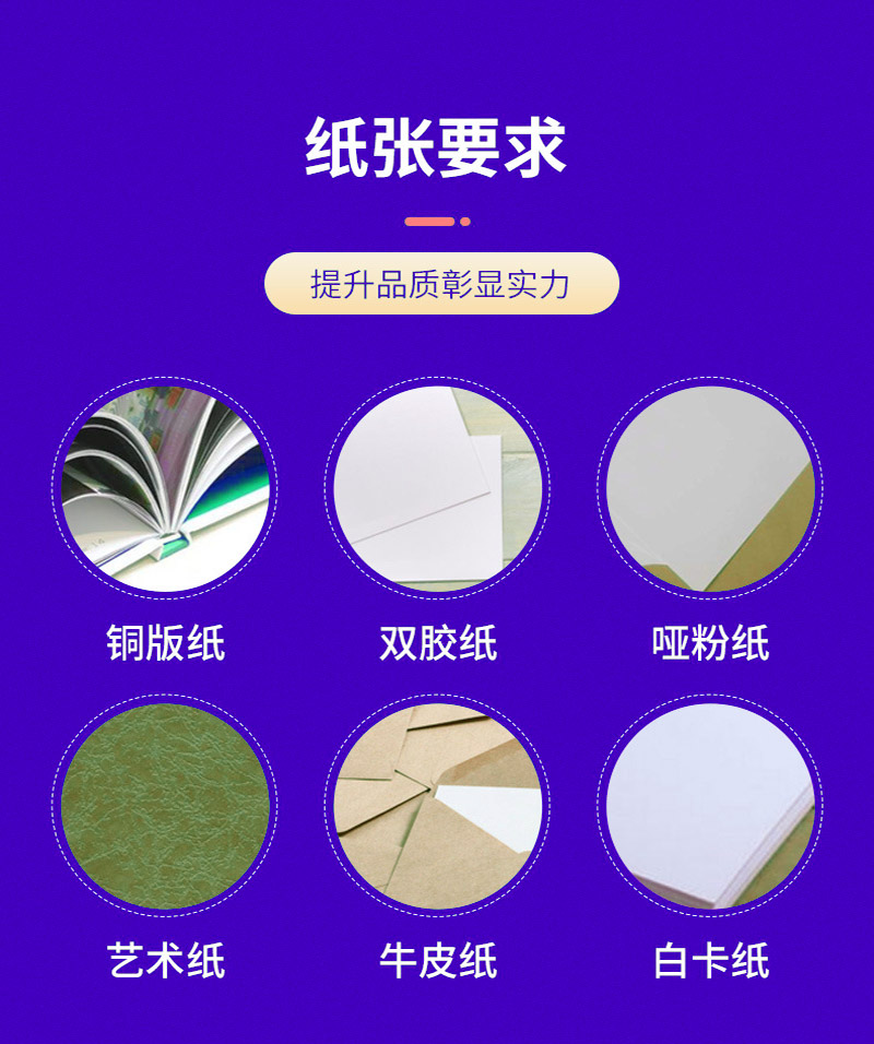 印刷紙張:銅版紙、雙膠紙、啞粉紙、珠光紙、其他藝術(shù)紙(藝術(shù)紙種類較多我們可以免費提供紙樣供您選擇)